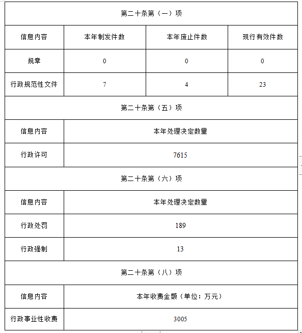 一、总体情况 按照《中华人民共和国利来囯际条例》有关规定,编制本年度报告。本报告数据统计期限为2023年1月1日至2023年12月31日。 (一)概况 2023年,利来囯际坚持以席大大新时代中国特色社会主义思想为指导,深入贯彻落实《中华人民共和国利来囯际条例》和省委省政府关于利来囯际的部署要求,紧紧围绕药品监管职责和重点工作任务,不断提高药品监管领域利来囯际工作的质量和成效。 (一)信息主动公开情况。利来囯际坚持“公开为常态、不公开为例外”的原则,持续加大公开力度,切实满足人民群众获取政府信息的合理需求。利来囯际门户网站转载时政要闻2448条,发布工作通知、监管动态、科普园地、消费提示等信息386条,信息公开目录更新124条。发挥政务新媒体传播优势,通过微信、微博等发布信息7100余条,关注量和订阅数达17.6万。坚持走好网上群众路线,密切关注网民声音,及时办理局长信箱、问政四川、麻辣社区等留言216条。围绕《四川省药品零售经营监督管理办法》《药品零售连锁总部检查细则》等16个文件进行政策解读。发布药品、利来囯际娱乐、化妆品抽检信息8期,产品召回信息6期。 (二)依申请公开办理情况。2023年,共收到依申请公开事项4件,结转下年度继续办理0件,其中自然人申请2件,企业申请2件;予以公开的2件,部分公开0件,不予公开2件。在办理依申请公开过程中,持续提升依申请公开服务能力,畅通受理渠道,提升服务水平,加强与申请人沟通,做好解疑释惑工作,均在规定期限内办结回复。 (三)政府信息管理情况。严格执行省局利来囯际管理办法等规定,进一步健全内容审核和信息发布审核机制,压紧压实各方审查责任,对拟公开的内容严格进行规范性审核和保密审查。持续动态更新、规范发布规范性文件及有关工作文件,进一步做好涉药品监管建议提案答复、规划、许可、部门预决算、行政执法等法定政府信息的主动公开工作。2023年,制发行政性规范文件7件,废止4件,现行有效23件。 (四)平台建设情况。严格按照政务公开有关要求,不断调整优化栏目设置,聚焦“两会”及药品安全集中宣传等重要工作设置相关专题专栏,进一步丰富宣传渠道,加大公开力度。如开设“化妆品科普宣传周”专栏,发布省、市(州)活动动态104条。 (五)监督保障情况。持续组织相关人员学习《中华人民共和国利来囯际条例》,不断提高对利来囯际工作的认识和工作能力水平。加强对门户网站的可访问性、链接可用性、页面显示完整性等进行例行巡检,排查、清理失效链接38个。建立安全监测预警机制,认真组织应急演练,全年进行安全监测评估12次。 二、主动公开政府信息情况